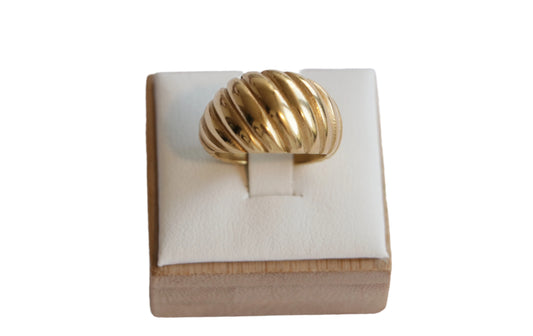 • טבעת SHTI מזהב בעיצוב גלי בולט, מוצגת על כרית לבנה, מבט תקריב בזווית קדמית.
