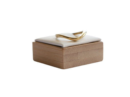 • טבעת STAN RING מזהב מבריק בעיצוב גלי פיסולי, מוצגת על מעמד עץ עם כרית בהירה, מבט צד.