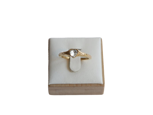 • תקריב של טבעת ZARK RING זהב עם אבן לב שקופה, מוצגת על סטנד עץ בהיר בזווית קדמית-צדית.