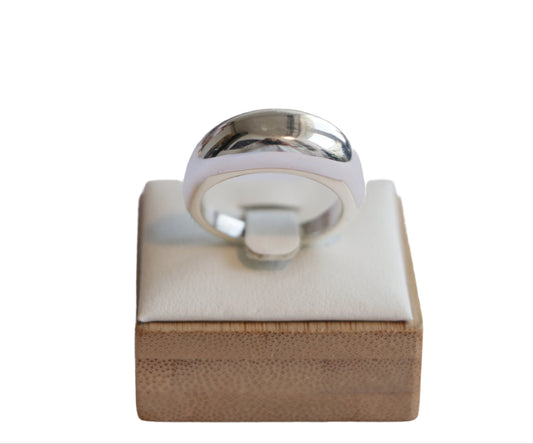 • טבעת NIRI RING מכסף סטרלינג בגימור מלוטש וכיפתי, מוצגת במבט קרוב על כרית לבנה על מעמד עץ במבוק.