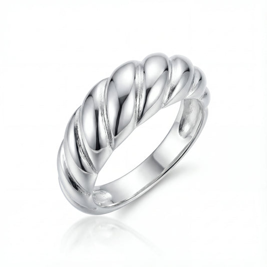 • טבעת LAR RING כסף מבריקה עם פיתולים בולטים, מוצגת על מעמד מרופד עם בסיס עץ, מבט תקריב מלמעלה.
