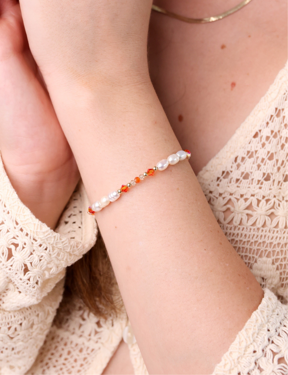 צמיד פניני מים מתוקים משולב חרוזי סברובסקי בצבעי אפרול שפריץ ובז', משובץ עם חרוזי גולדפילד. הצמיד נעשה בעבודת יד ומגולדפילד 14 קראט.