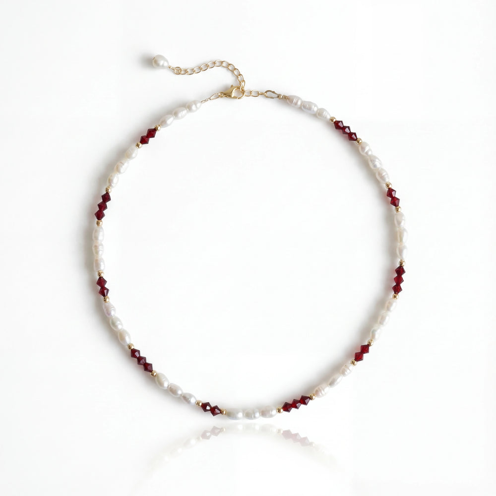 שרשרת עבודת יד, פניני מים מתוקים משולבת חרוזי סברובסקי בורדו ומשובצת עם חרוזי גולדפילד 14 קראט.