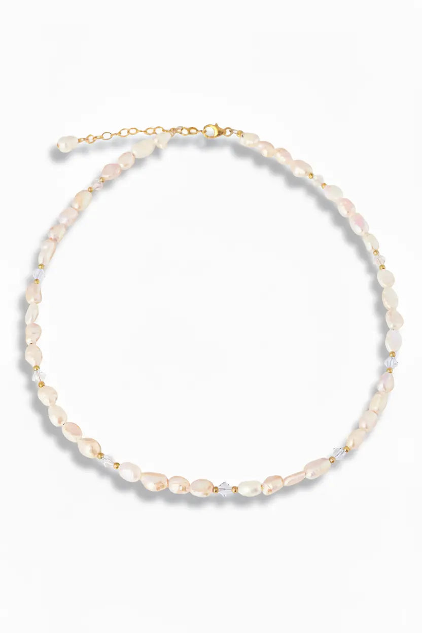שרשרת עבודת יד, פניני מים מתוקים משולבת חרוזי סברובסקי קוורץ שקוף ומשובצת עם חרוזי גולדפילד 14 קראט.