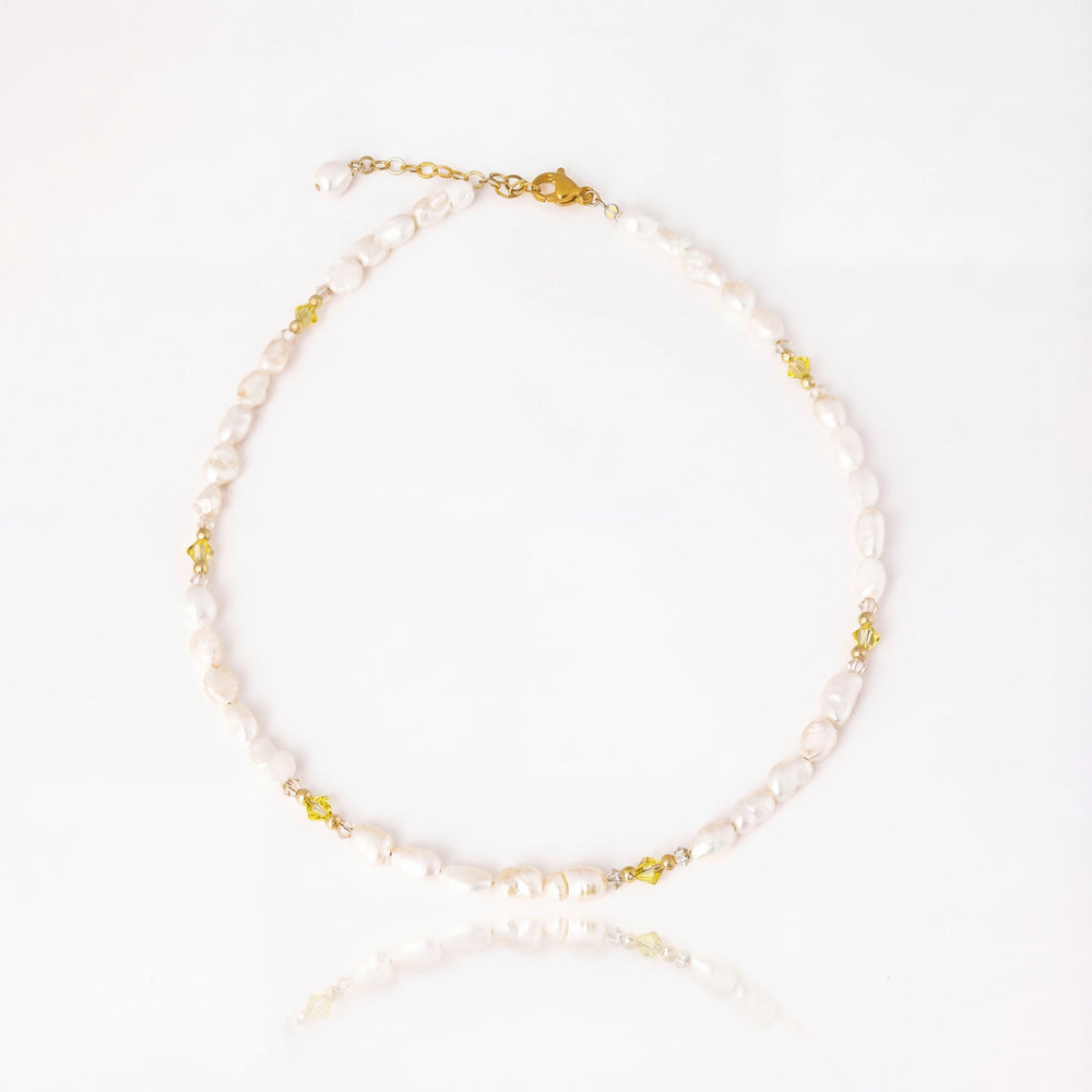 שרשרת פניני מים מתוקים משולבת חרוזי סברובסקי בצבעי צהוב ובז', משובץ עם חרוזי גולדפילד. השרשרת עשויה בעבודת יד ומגולדפילד 14 קראט זהב.