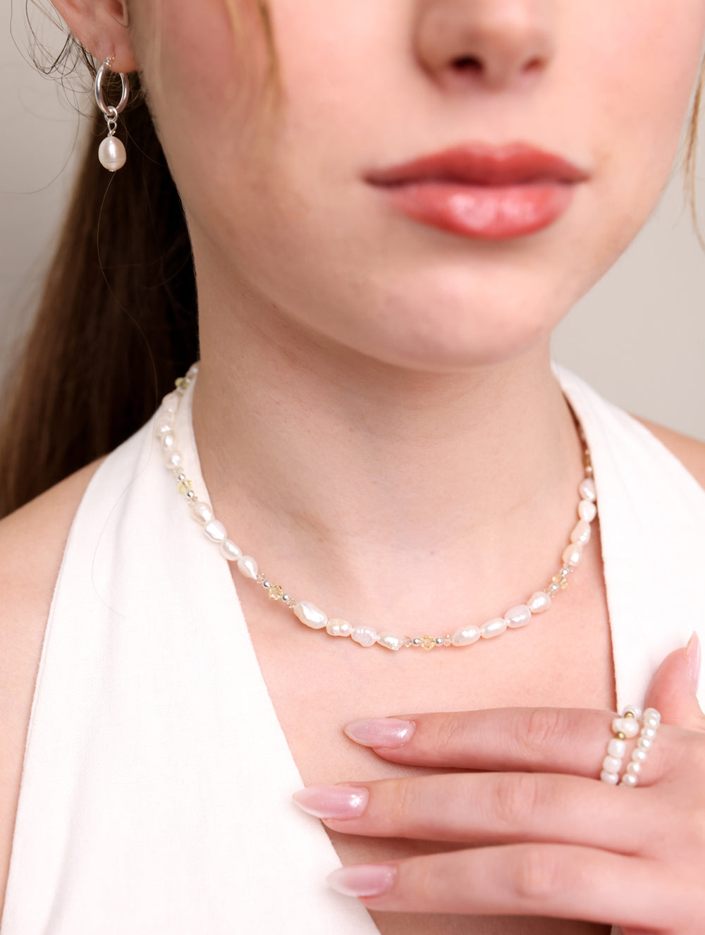 שרשרת עבודת יד, פניני מים מתוקים משולבת חרוזי סברובסקי צהוב ובז' ומשובצת עם חרוזי כסף 925 טהור.