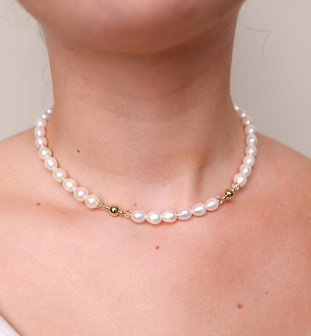 שרשרת פניני מים מתוקים מלכותית ואצילית בשילוב חרוזי גולדפילד 6 מ"מ וחרוזי סברובסקי בצבע בז. השרשרת עשויה בעבודת יד ומגולדפילד 14 קראט זהב.