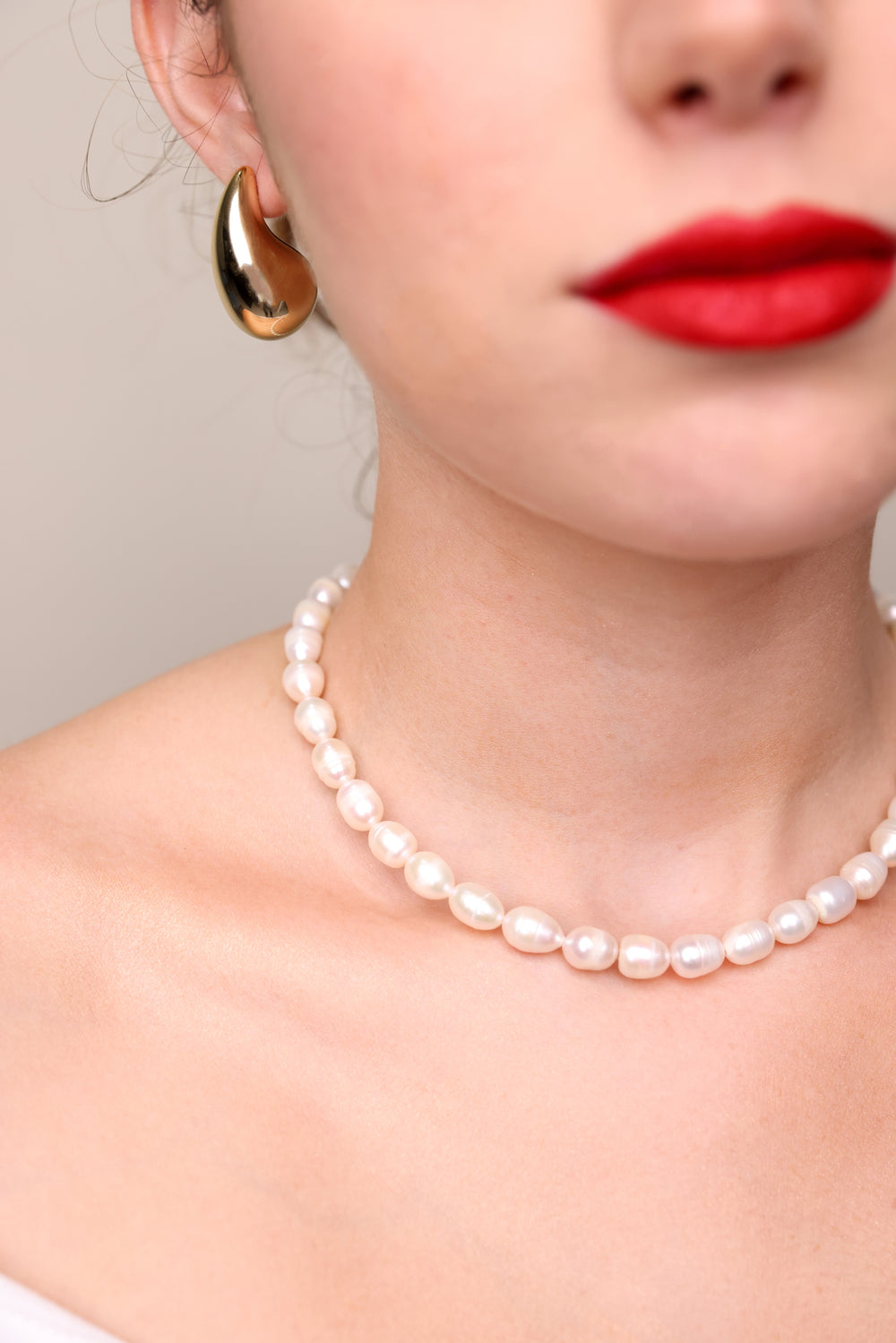 שרשרת פניני מים מתוקים גדולים, עם נוכחות מרשימה וקלאסית. השרשרת עשויה בעבודת יד ומגולדפילד 14 קראט זהב