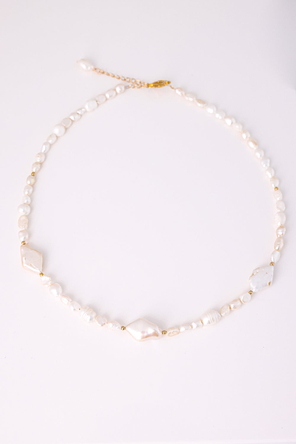 שרשרת פניני מים מתוקים משולבת פנינים מעויינים למראה מתוחכם ווינטאג', בשילוב חרוזי גולדפילד. השרשרת עשויה בעבודת יד ומגולדפילד 14 קראט זהב.