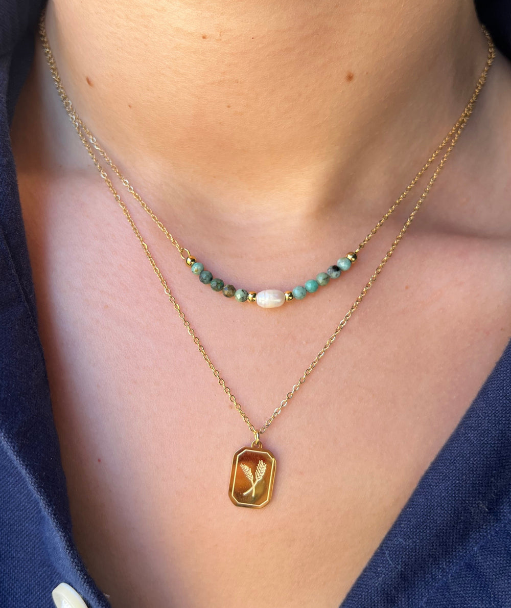 שרשרת כפולה סטיינלס סטיל עם חרוזים טורקיז אפריקאי ותליון מעוטר.