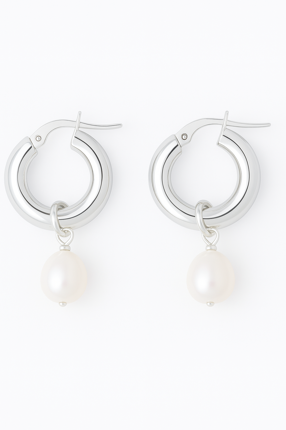 עגילי חישוק בעיצוב נקי ואלגנטי, עשויים מכסף 925 טהור ותליון פנינה בגוון כסף קלאסי. מתאימים לכל לוק.