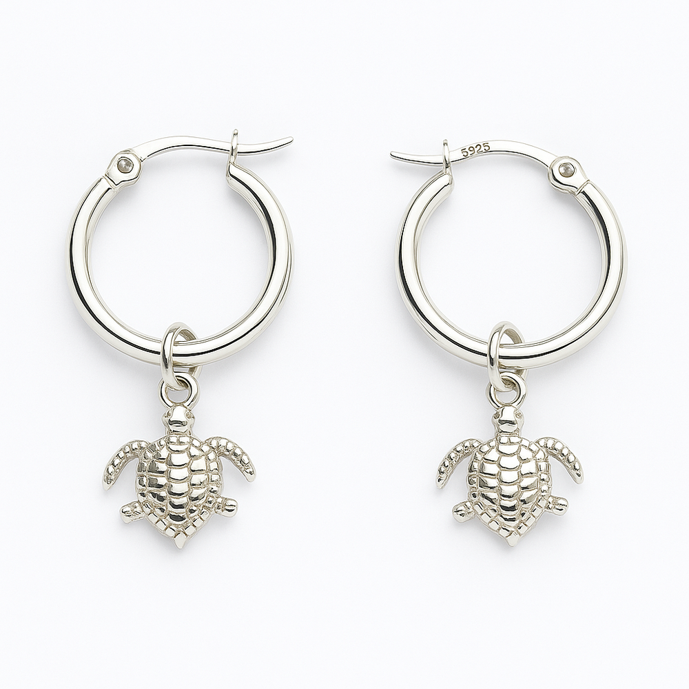 עגילי חישוק מכסף 925 עם תליון צב עדין. העיצוב הנקי והמדויק מעניק מראה אלגנטי אך יום יומי. הסוגר נוח ובטוח ונושא חותמת S925. פריט קלאסי לאוהבות הים והטבע.
